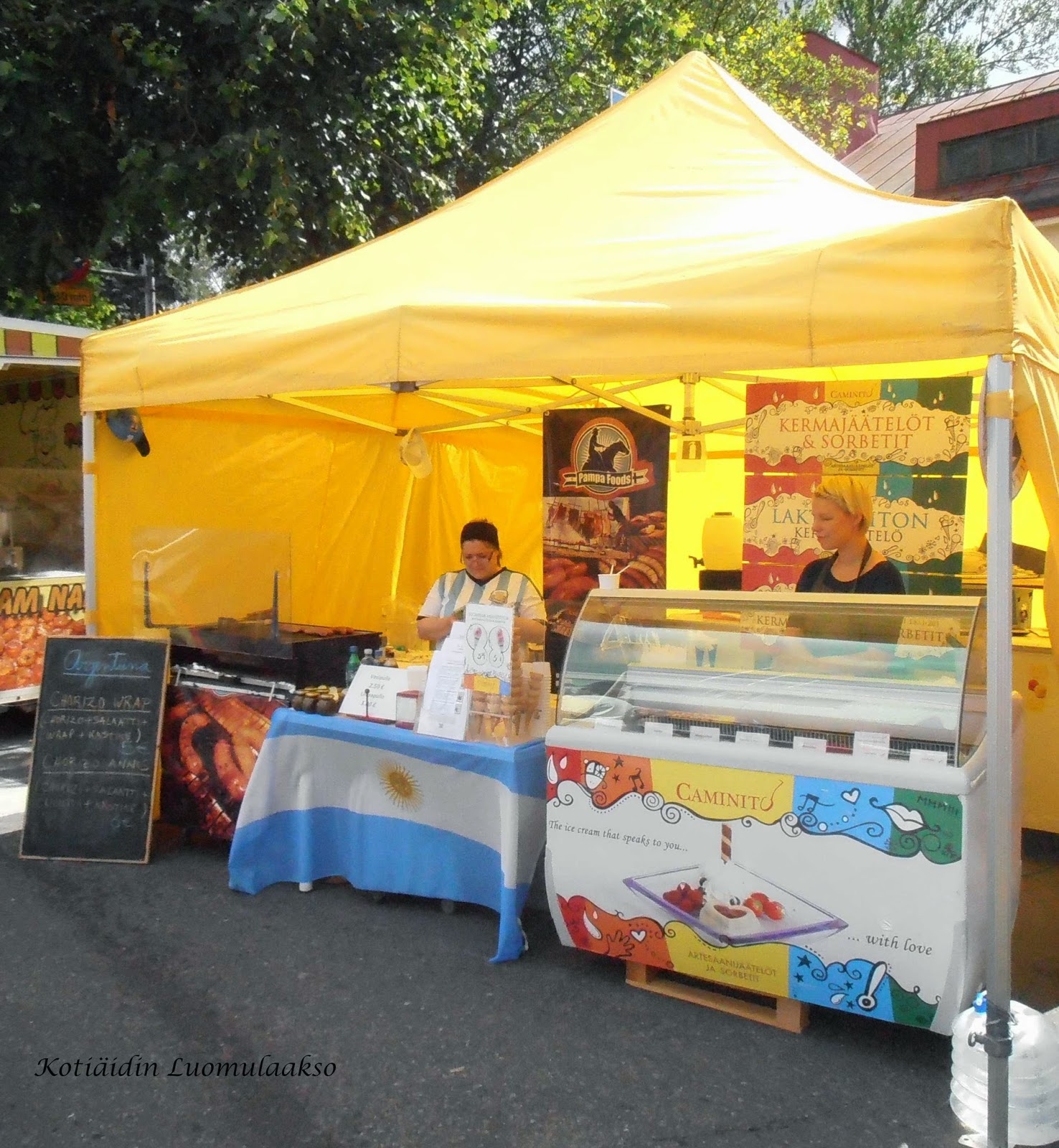Veljeni piristi arkeani viemällä minut Kansainvälisille Suurmarkkinoille ja sain vielä käyttörahaakin käteeni sekä ruokaa masuuni – ja kyllä siellä herkkuja riittikin! Muutamia luomutuotteitakin onnistuin siellä bongaamaan, mutta enemmänkin niitä olisi saanut olla. Jäätelö, ruis ja lihatuotteet olivat kuitenkin ne luomuiset jutut markkinoilla tänä vuonna – ehkäpä ensi vuonna joukossa olisi muutama muukin! Kansainväliset markkinat olivat pullollaan kaikkea ihanaa!