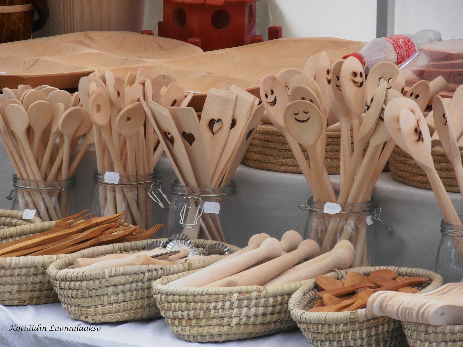 Erilaisia puustatehtyjä tuotteita oli paljon myynnissä: Tuoleista voiveitsiin ja ja lasten hyrriin.