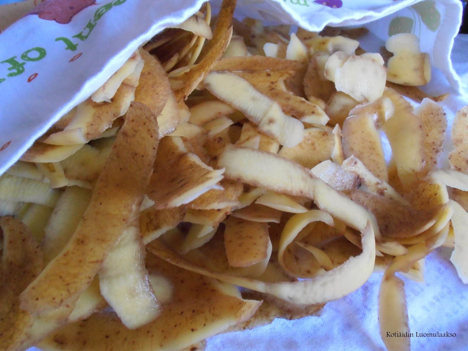 Osa kokeiluista ei ole ollut ihan niin onnistuneita ja vielä on ideoita jäljellä ja uusia syntyy, kun edelliset saa kokeiltua. Ohi nopeasti hujahtaneen perunaviikon hengessä ovat perunoidenkuoret olleet kokeilulistan kärjessä ja erilaisia ideoiita onkin saanut hyvin testailtua, kun banaaninkuoret ovat vielä olleet likoamassa.